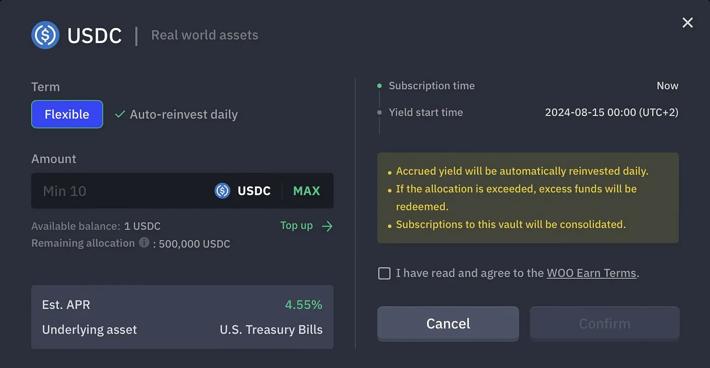 Woo X has upgraded its Treasury Bill-backed USDC Earn Vault, to allow all WOO X users to instantly earn interest on USDC deposits, which compounds daily and can be withdrawn at anytime.